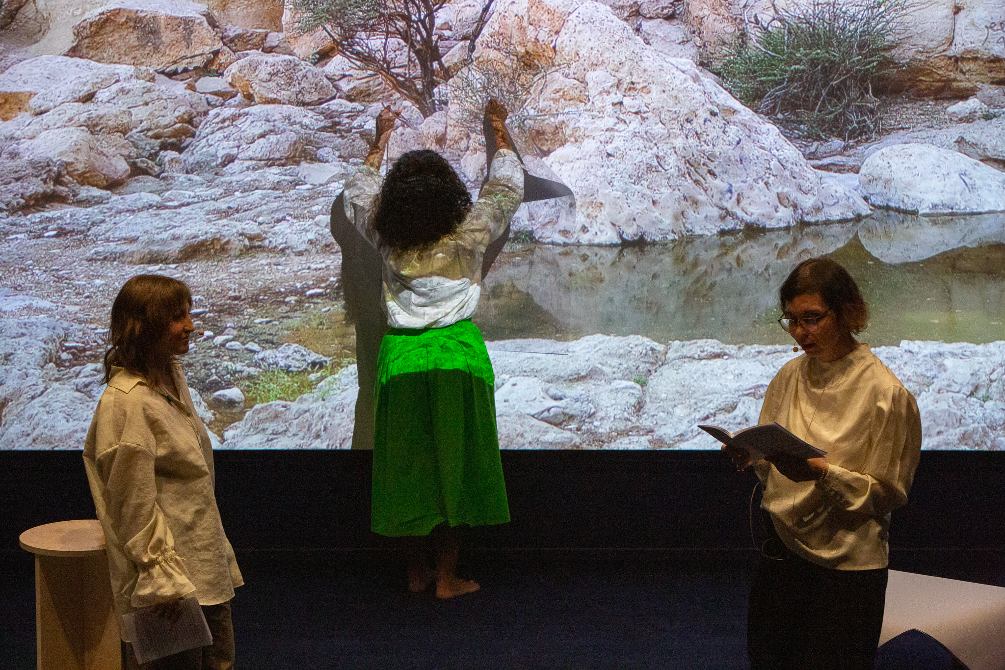 Working with collaborators Tamara Kalo and Ileana Gonzalez Pacheco, artist Jumana Emil Abboud has created an immersive study of local folktales and the experience of embedding herself in the Riyadh landscape. The performance took place in May 2024 at the Diriyah Contemporary Art Biennale as part of the Biennale Encounters program.